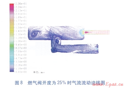 利用FLUENT軟件對比模擬了燃?xì)忾y開度為25%和75%兩種條件下爐腔內(nèi)的氣體流動狀態(tài)。計算得出兩種狀態(tài)下整個爐腔內(nèi)氣流的最高流速分別為24.61m/s和46.86m/s。高速流主要出現(xiàn)在爐腔排氣導(dǎo)管。