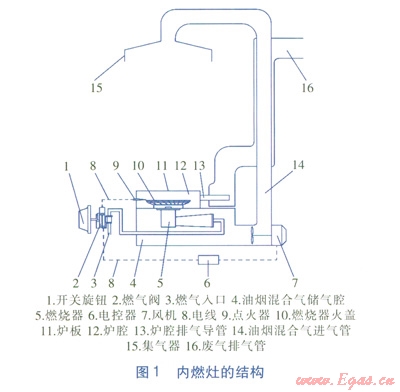 內(nèi)燃灶的結(jié)構(gòu)見圖l。工作時,空氣連同炊事產(chǎn)生的油煙、水蒸氣通過風(fēng)機壓送到封閉的爐腔內(nèi),燃?xì)庠谧陨韷毫ψ饔孟逻M(jìn)入燃燒器,并在高于大氣壓的條件下燃燒,加熱爐板,爐板可直接加熱食物或其他烹飪炊具;高溫廢氣在排出的過程中加熱油煙混合氣進(jìn)氣管內(nèi)的氣體,減少廢氣余熱的浪費,提高系統(tǒng)熱效率[5]。