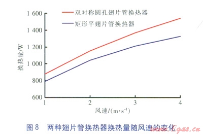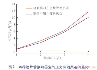 對稱圓孔翅片管具有優(yōu)越的強(qiáng)化傳熱效果。風(fēng)速范圍為l~4m/s時,與矩形平翅片管換熱器相比,對稱圓孔翅片管換熱器的換熱量平均提高了12.8%,空氣壓力降提高并不明顯。