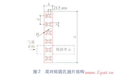 研究對象選取單排換熱管的矩形平翅片管換熱器、雙對稱圓孔翅片管換熱器,幾何尺寸按照文獻(xiàn)[7]中實(shí)驗(yàn)樣件的尺寸確定,基本尺寸:換熱管外徑Do為25mm,翅片厚度d為0.5mm,換熱管間距d為76mm,翅片間距s為10mm,翅片寬度b為6lmm,翅片長度L為296mm,圓孔間距e為26mm,圓孔直徑D為14mm。兩種翅片管換熱器的翅片數(shù)均為28片,矩形平翅片管換熱器總換熱面積為1.1139m2,雙對稱圓孔翅片管換熱器總換熱面積為1.1089m2。由于翅片管換熱器所有翅片幾何結(jié)構(gòu)相同,為了簡化研究,取單個翅片作為研究對象,根據(jù)對稱特性,取其中的一個區(qū)域作為模擬單元進(jìn)行研究。矩形平翅片、雙對稱圓孔翅片結(jié)構(gòu)分別見圖1、2。