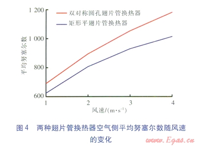 兩種翅片管換熱器空氣側(cè)平均努塞爾數(shù)隨風(fēng)速的變化見圖4。由圖4可知,隨著風(fēng)速的增大,兩種翅片管換熱器空氣側(cè)平均努塞爾數(shù)均明顯增大,且相同風(fēng)速下雙對稱圓孔翅片管換熱器空氣側(cè)平均努塞爾數(shù)明顯高于矩形平翅片管換熱器。