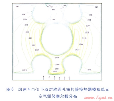 風(fēng)速4m/s下兩種模擬單元空氣側(cè)努塞爾數(shù)分布見圖5、6。由圖5、6可知,矩形平翅片管換熱器模擬單元空氣側(cè)努塞爾數(shù)的最大值出現(xiàn)在換熱管的兩側(cè),雙對稱圓孔翅片管換熱器模擬單元的最大值出現(xiàn)在流動的起始位置;最小值均出現(xiàn)在換熱管后尾流區(qū)。在相近位置上,雙對稱圓孔翅片管換熱器模擬單元空氣側(cè)努塞爾數(shù)明顯高于矩形平翅片管換熱器模擬單元,這說明前者的傳熱性能優(yōu)于后者。