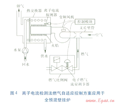 用離子電流檢測法來監(jiān)控火焰是否正常的方法已廣泛應(yīng)用于現(xiàn)有燃具產(chǎn)品中。因此,離子電流檢測法應(yīng)用于燃氣壁掛爐,進行燃燒工況的實時監(jiān)測是成熟的技術(shù)。傳統(tǒng)全預(yù)混壁掛爐應(yīng)用的離子電流檢測法,只是檢測一個固定火焰離子電流信號,用以判斷火焰是否存在。而燃氣自適應(yīng)全預(yù)混壁掛爐應(yīng)用的離子電流檢測法,是通過檢測火焰離子電流信號來判斷和調(diào)節(jié)空燃比。