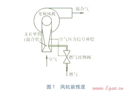 目前市場上的全預(yù)混冷凝式燃氣壁掛爐(以下簡稱全預(yù)混壁掛爐)主要有風(fēng)機前預(yù)混、風(fēng)機后預(yù)混兩種,分別見圖l、2。變頻風(fēng)機、燃氣比例閥[2-3]提供燃燒所需的空氣與燃氣,空氣與燃氣按設(shè)定好的空燃比進行混合燃燒。