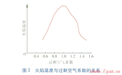 要實現(xiàn)穩(wěn)定的全預(yù)混燃燒,關(guān)鍵在于保持合理、穩(wěn)定的空燃比。實驗證明,全預(yù)混燃燒空燃比過大或者過小都會對燃燒造成不利影響。空燃比過大時,多余空氣會帶走熱量,火焰溫度降低,熱效率降低;空燃比過小時,燃燒不充分,火焰溫度及熱效率亦降低。同理,當(dāng)空燃比過大時,多余的空氣會稀釋離子;過小時,由于未能充分反應(yīng),燃燒過程未能產(chǎn)生足夠多的離子。火焰溫度與過??諝庀禂?shù)的關(guān)系見圖3。由圖3可知,當(dāng)空燃比最佳時,火焰溫度達到峰值,火焰離子電流也達到峰值。這是離子電流檢測法用于判斷全預(yù)混燃燒空燃比的理論依據(jù)。