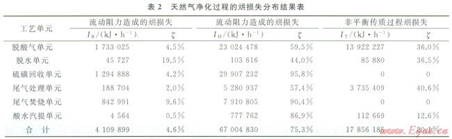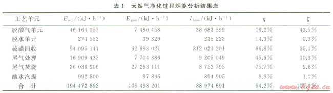 由表l可以看出,硫磺回收單元和尾氣處理單元效率最高,這是由于這2個(gè)單元主要為過程余熱回收單元,將過程反應(yīng)產(chǎn)生的余熱通過余熱鍋爐進(jìn)行回收;而脫酸氣單元和脫水單元的效率較低是由于其再生過程為一個(gè)能低效的過程。從整個(gè)過程的損失分布來看,脫酸氣單元的損失最高,這是由于普光氣田天然氣凈化廠處理的原料氣中H2S含量很高,需要更大溶劑循環(huán)量才能使凈化氣達(dá)到商品氣標(biāo)準(zhǔn),這導(dǎo)致再生過程的能耗大大增加,而溶液再生過程為典型的低效過程,因此造成了較高的損失。