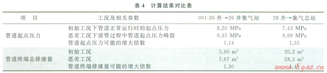 由表4與圖8、9可知,當(dāng)管內(nèi)氣相流速與氣液比均減小時(shí),清管過程中管道的起點(diǎn)壓力峰值和終端排液量均將增大,但不同管道的增大幅度并不一致,體現(xiàn)出的基本規(guī)律為:管道越長(zhǎng)或高程差越大,清管中管道的起點(diǎn)壓力峰值和終端排液量增大幅度越大。其中,對(duì)管道較長(zhǎng)高程差較大的28井®集氣總站管道而言,在管道運(yùn)行到后期可能遇到的惡劣工況下清管過程中管道起點(diǎn)壓力將比管道運(yùn)行初期正常運(yùn)行工況下的起點(diǎn)壓力增大1.35倍,而終端排液量則比管道運(yùn)行初期清管過程中的排液量增大1.41倍。