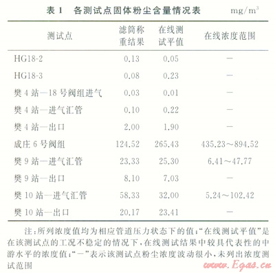 測試中,分別對樊3站、樊4站、樊9站和樊10站的進(jìn)口匯管和出口的粉塵濃度進(jìn)行測試,期望得到各站的進(jìn)出口的粉塵濃度水平,間接分析場站過濾分離設(shè)備和壓縮機(jī)的運行情況。由分析可知,在考慮到氣體壓力狀態(tài)的情況下,樊3站、樊9站和樊l0站都能對進(jìn)站氣體進(jìn)行較有效的分離,但同時出口處的粉塵濃度尚有較大的降低空間。以樊9站為例,通過比較濾芯的最佳過濾氣速和實際過濾氣速可知,由于生產(chǎn)氣量的增大超出了過濾設(shè)備的最佳處理氣量,該站的濾芯處于超負(fù)荷運行,同時由于樊9站進(jìn)氣粉塵濃度處在較高的水平,從而使得站內(nèi)濾芯更換頻率較高。