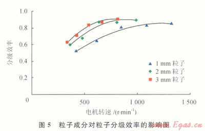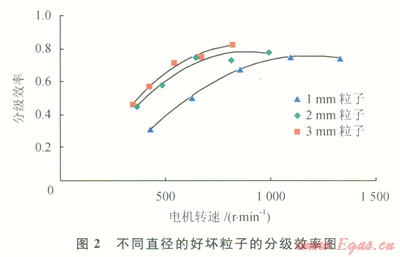 實(shí)驗(yàn)材料仍為直徑分別為1mm、2mm、3mm的好壞粒子的混合物,但好壞粒子混合比例變?yōu)?span lang="EN-US">1:1(體積比),得到分級(jí)效率和電機(jī)轉(zhuǎn)速之間的關(guān)系(圖4)。