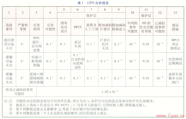 ①LOPA技術(shù)是一種過程危險分析工具,是一種半定量的分析評估技術(shù)。它將危險與可操作分析(HAZOP)導(dǎo)出的危險事件定性給出;定量計算每個獨立保護層(Independent Protection Layer,IPL)的失效概率以及全部保護層總的“已減輕的事件可能性”以及殘余風(fēng)險;再依據(jù)本公司風(fēng)險目標(biāo)值,定量評估殘余風(fēng)險值是否可以接受。
