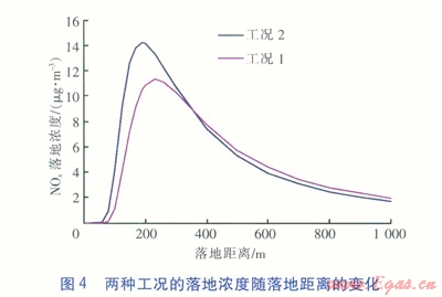 表2中木表示折算值,是將工況1排放量折算到與工況2相同供熱量條件下的數(shù)據(jù)。標準狀態(tài)是指101325Pa、0℃,工況1煙氣排放量對應狀態(tài)為101360Pa、54.1℃,工況2煙氣排放量對應狀態(tài)為101310Pa、22.3℃。NOx最大落地濃度和最大落地距離見表2。落地濃度隨落地距離(落地處與煙囪的距離)的變化見圖4。