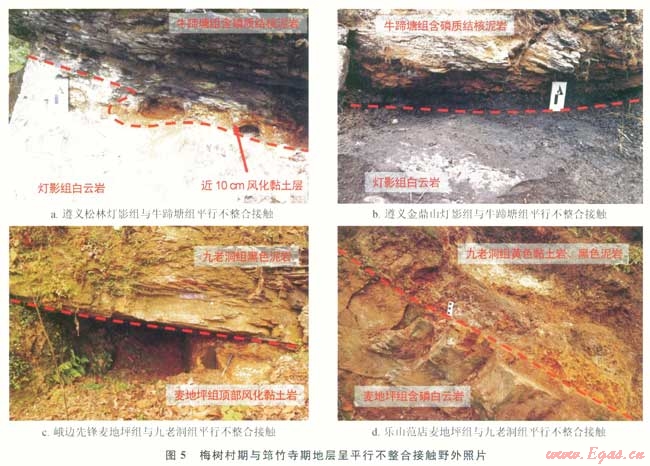 黔北遵義松林、金鼎山地區(qū)梅樹村組與燈影組上亞段幾乎均被剝蝕,牛蹄塘組與燈影組下亞段直接接觸,接觸面凹凸不平,松林地區(qū)見厚約10cm的風(fēng)化黏土層;川西南峨邊先鋒、樂山范店九老洞組底部見鐵質(zhì)風(fēng)化黏土層,與麥地坪組呈平行不整合接觸(圖5);川北米倉山福成剖面寬川鋪組厚20cm石灰?guī)r頂面凹凸不平,其上部與郭家壩組黑色頁巖呈平行不整合接觸[21]。
