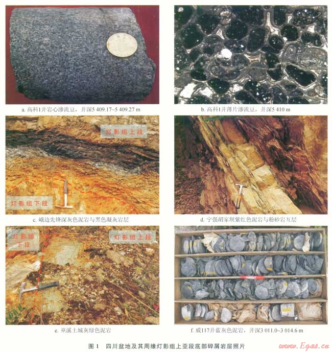 該期抬升運(yùn)動(dòng)發(fā)生于燈影組下亞段沉積后,上揚(yáng)子地臺(tái)發(fā)生整體強(qiáng)烈抬升,具有兩個(gè)方面的響應(yīng)特征:①抬升運(yùn)動(dòng)使燈影組下亞段微生物白云巖露出水面遭受大氣淡水溶蝕而發(fā)育溶蝕孔洞、滲流豆、鈣結(jié)殼、古風(fēng)化殘積礫屑云巖、巖溶角礫巖等。滲流豆石層的頂面是一個(gè)比較截然的界面,或者說是一個(gè)暴露面或間斷面,滲流豆的出現(xiàn)反映其形成時(shí)處于陸上暴露的環(huán)境[18]。高科l井在井深5409~5410m發(fā)育明顯的滲流豆(圖1-a、1-b)。②燈影組下亞段抬升風(fēng)化剝蝕后,地殼發(fā)生強(qiáng)烈伸展作用[19],上揚(yáng)子地臺(tái)重新開始接受海侵沉積,沉積物主要為藍(lán)灰色泥巖、黑色頁巖、紫紅色泥巖、砂巖、泥質(zhì)云巖與硅質(zhì)巖,厚數(shù)十厘米至數(shù)十米不等。該“碎屑巖層”與燈影組下亞段呈平行不整合接觸,接觸面凹凸不平(圖1-c、l-f)。