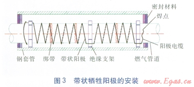 ②不可避免使用套管時,可在套管內(nèi)部采取局部的陰極保護也是一種很有效的辦法。具體做法是:在套管內(nèi)的主管道上纏繞鎂陽極帶或鋅陽極帶或安裝鐲式陽極[4]。當主管道外防腐層為3PE防腐時,推薦使用纏繞鎂陽極帶的局部陰極保護。安裝鎂陽極帶時,可采用機械打磨的方法,露出里面的鋼管約3~5cm癌主管道上開鑿一個合適的焊點,采用電焊、鋁熱焊等焊接方式把鎂陽極帶一端焊接到主管道上,根據(jù)不同的管徑按照一定的角度和間距,貼著管道的外壁緊緊纏繞。針對不同管徑,鎂陽極帶有不同的纏繞角度:當燃氣管道外徑≤219mm時,鎂陽極帶沿管道外壁等距且與管道軸向成30°角纏繞;當燃氣管道外徑為219~377mm時,沿管道外壁等距且與管道軸向成45°角纏繞;當燃氣管道外徑≥377mm時,沿管道外壁等距且與管道軸向成600角纏繞[4]。鎂陽極帶另一端也要和起點一樣,焊接在主管道上,而且兩個焊點都要做好絕緣防腐。鎂陽極帶纏繞施工完畢,套管兩端應采用柔性的防腐、防水材料密封,并保證密封良好,防止水或其他雜物的進入。纏繞鎂陽極帶法的優(yōu)點是施工簡單方便,缺點是鎂的電位較負,保護年限不是很長[4]。帶狀犧牲陽極的安裝見圖3。