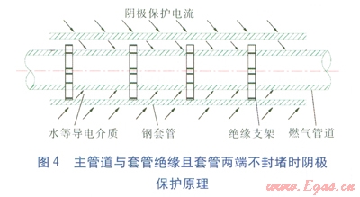 ③不可避免加設套管時,套管兩端可不必密封防水材料,只要在主管道與套管之間充填柔軟材料防止沙石進入對防腐層起破壞作用即可。因為當套管內(nèi)有水或泥土存在時,能起到導電介質(zhì)的作用,陰極保護電流通過介質(zhì)形成回路,不會被屏蔽。套管可視為土壤介質(zhì)的一部分,陰極保護電流從套管外壁流入,從套管內(nèi)壁流出,再從主管道外部流入,主管道將受到很好的陰極保護[2]。如果套管與主管道間有特定性能的電解質(zhì)物質(zhì),導電性能會更好,主管道陰極保護的效果會更好,其原理見圖4。