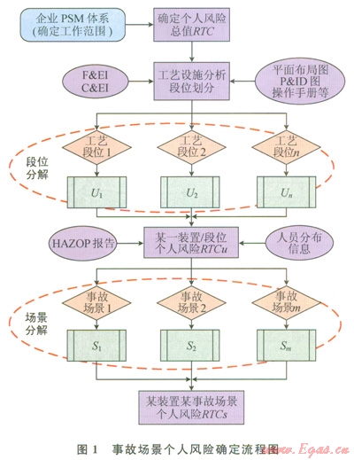 在獲得各工藝段位的個(gè)人風(fēng)險(xiǎn)準(zhǔn)則RTCU之后,進(jìn)入圖1所示的第2階段的場(chǎng)景分解:根據(jù)HAZOP報(bào)告(或其他的工藝災(zāi)害分析PHA結(jié)果),以及設(shè)施的人員分布信息,由下式計(jì)算各事故單元的個(gè)人風(fēng)險(xiǎn)準(zhǔn)則RTCS。即