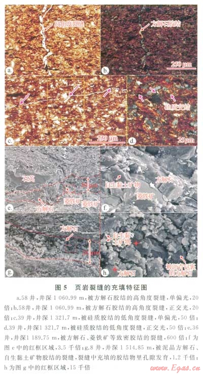 頁巖不但是頁巖氣的烴源巖和儲層,超低的孔滲性還使得頁巖可成為頁巖氣的蓋層[13-14]。但這并非表明頁巖氣的賦存對蓋層條件沒有嚴格要求。在孔滲條件較優(yōu)越地區(qū),蓋層條件可能是需要上覆蓋層。例如美國的Barnett頁巖其上覆“蓋層”為石灰?guī)r[10]。對于孑L滲條件差但裂縫發(fā)育的地區(qū),蓋層條件則是裂縫需要被充填。以長7段頁巖為例,部分頁巖裂縫極其發(fā)育,但裂縫并沒有破壞其含氣性,原因在于一些裂縫被高度充填,阻止了氣體的二次運移。長7段頁巖的裂縫膠結(jié)物包括方解石膠結(jié)物(正交光下顯示高級干涉色,圖5-a、5-b)和硅質(zhì)膠結(jié)物(正交光下顯示一級灰干涉色,圖5-c、5-d)。被嵌晶連晶方解石或硅質(zhì)膠結(jié)物充填的裂縫較致密、結(jié)晶較大、晶形完整,膠結(jié)礦物主要為碳酸鹽類,以方解石為主,局部見菱鐵礦,可見自生黏土礦物充填晶間縫(圖5-e、5-f)。被泥晶方解石和黏土礦物充填的裂縫較疏松,膠結(jié)物中發(fā)育晶間孔孔隙,泥晶方解石膠結(jié)物大小介于5~10mm,自生黏土礦物晶體大小介于l~2mm(圖5-g、5-h)。