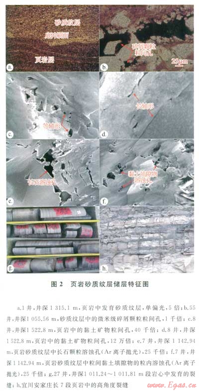 砂質(zhì)紋層廣泛發(fā)育原生粒間孔和次生溶蝕孔。原生粒間孔主要是碎屑顆粒粒間孔與黏土礦物粒間孔。碎屑顆粒粒間孔在砂質(zhì)紋層中極為常見,該類孔隙的孔隙形態(tài)多呈不規(guī)則的多邊形,直徑以微米級至幾十微米為主(大孔級)(圖2-a、2-b)。黏土礦物粒間孔是黏土礦物(主要是伊利石與綠泥石)圄成的孔隙空間,掃描電鏡下常見長軸形和等軸形2種形態(tài)(圖2-c、2-d)。長軸形由于壓實的影響而呈“縫”狀,其孔徑大小可達數(shù)十納米(中孔級),一般沿黏土礦物層理呈定向分布;等軸形是黏土礦物顆粒在強水動力環(huán)境堆積而成的粒間孔,或者是黏土絮凝物在靜水環(huán)境殘留下來的殘余孔(一般為大孔級),分布較雜亂。次生溶蝕孔一般發(fā)育在長石及碎屑顆粒的粒間填隙物內(nèi)(圖2-c、2-f),包括粒間孔、粒內(nèi)孔和鑄??祝粤ig孔為主。粒間孔形態(tài)各異,常見港灣狀溶蝕邊緣,直徑以數(shù)十至數(shù)百納米為主(中孔級);粒內(nèi)孔多納米級(小孔級);鑄??装w粒間易溶物鑄模和顆粒鑄模,孔徑變化較大。砂質(zhì)紋層還發(fā)育構(gòu)造裂縫,裂縫面比較粗糙,以高角度縫為主,產(chǎn)狀不穩(wěn)定(圖2-g、2-h)。