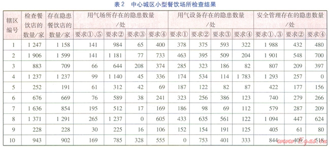 自2012年11月山西壽陽(yáng)火鍋店發(fā)生燃?xì)獗ㄊ鹿屎?,武漢市立即開(kāi)展對(duì)餐飲場(chǎng)所的用氣安全檢查。按武漢市出臺(tái)的《商用燃?xì)庠罹咴O(shè)施安裝及驗(yàn)收技術(shù)規(guī)程》(以下簡(jiǎn)稱(chēng)《規(guī)程》)的規(guī)定,使用管道氣的餐飲場(chǎng)所在通氣前須進(jìn)行驗(yàn)收,且管道氣供氣單位須定期上門(mén)對(duì)用氣場(chǎng)所進(jìn)行安全檢查。因此,此次用氣安全檢查的重點(diǎn)是使用瓶裝氣的餐飲場(chǎng)所。根據(jù)GB 50028—2006《城鎮(zhèn)燃?xì)庠O(shè)計(jì)規(guī)范》、CJJ 94—2009《城鎮(zhèn)燃?xì)馐覂?nèi)工程施工與質(zhì)量驗(yàn)收規(guī)范》、《規(guī)程》等對(duì)瓶裝氣用氣場(chǎng)所提出的安全要求,制定了餐飲場(chǎng)所用氣安全檢查的內(nèi)容及要求(見(jiàn)表l)。
