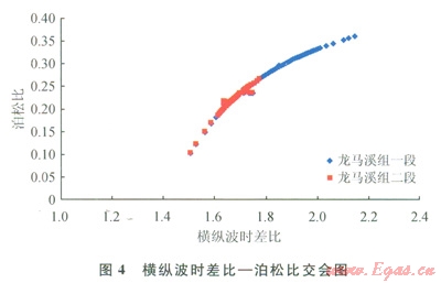 整體龍馬溪組楊氏模量介于l×104~3.5×104MPa,平均為2.3×104MPa;泊松比介于0.1~0.37,平均為0.24。通過圖3可以看出,龍馬溪組一段楊氏模量平均值為1.4×104MPa,泊松比平均值為0.3;龍馬溪組二段楊氏模量平均值為l.8×104MPa,泊松比平均值為0.23。龍馬溪組二段較龍馬溪組一段具有低泊松比,高楊氏模量,說明其脆性優(yōu)于一段。圖4為橫縱波時(shí)差比和泊松比的交會(huì)圖,可以看出龍馬溪組二段的橫縱波時(shí)差比明顯低于一段,說明低橫縱波時(shí)差比參數(shù)用于表征頁巖的脆性程度是有效的。