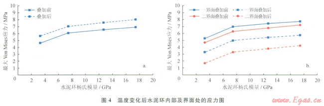 由圖4-a圖看出,水泥環(huán)內(nèi)的最大Von Miscs應(yīng)力隨水泥環(huán)楊氏模量的增大而增大;與初始應(yīng)力替加后,Von Mises應(yīng)力增大為4.4~8.0MPa,小于普通水泥環(huán)的屈服強(qiáng)度。所以,當(dāng)溫度變化幅度不大時(shí),水泥環(huán)通常不會(huì)發(fā)生屈服破壞,但溫度升高幅度較大時(shí)水泥環(huán)可能會(huì)發(fā)生屈服破壞。因此,對(duì)熱采井等應(yīng)避免使用膨脹水泥漿,且應(yīng)使用低楊氏模量的水泥環(huán)。由圖4-b可以看出,與初始應(yīng)力疊加前,一、二界面在徑向上受拉伸應(yīng)力的作用且應(yīng)力隨水泥環(huán)的楊氏模量增大而增大,為4.4~8.0MPa,遠(yuǎn)大于一、二界面膠結(jié)的抗拉強(qiáng)度,會(huì)破壞一、二界面膠結(jié);與初始應(yīng)力疊加后,徑向應(yīng)力顯著降低至1.4~6.0MPa,降低了一、二界面膠結(jié)破壞的風(fēng)險(xiǎn)。因此,通過降低水泥環(huán)楊氏模量和增大初始應(yīng)力都可以降低界面膠結(jié)破壞的風(fēng)險(xiǎn),建議采用較低楊氏模量的水泥環(huán)或使用膨脹水泥來預(yù)防失效。