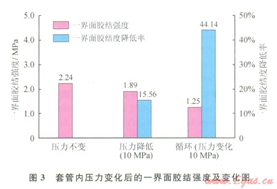 按照本文參考文獻(xiàn)[20]的方法制作固井封固系統(tǒng)模型,測(cè)試套管內(nèi)壓力變化對(duì)界面剪切膠結(jié)強(qiáng)度的影響。模型l制作完成后,模擬套管內(nèi)壓力不變的情況;模型2制作完成后,模擬套管內(nèi)壓力降低10MPa的情況;模型3制作完成后,模擬套管內(nèi)壓力循環(huán)變化的情況,變化幅度為l0MPa。測(cè)量并計(jì)算上述封固系統(tǒng)模型的一界面膠結(jié)強(qiáng)度,并分別以套管內(nèi)壓力不變時(shí)的一組模型的界面膠結(jié)強(qiáng)度為標(biāo)準(zhǔn),計(jì)算分析套管內(nèi)壓力變化時(shí)的一界面膠結(jié)強(qiáng)度變化(圖3)。