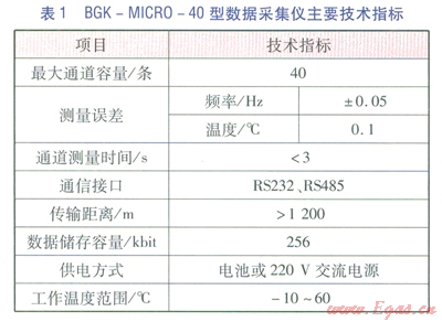 BGK-ICR0-40型數(shù)據(jù)采集儀見(jiàn)圖4,主要技術(shù)指標(biāo)見(jiàn)表l。BGK-MICR0-40型數(shù)據(jù)采集儀主要功能為:遠(yuǎn)程控制和數(shù)據(jù)采集功能?,F(xiàn)場(chǎng)操作功能:預(yù)留有與便攜式計(jì)算機(jī)的接口,可實(shí)現(xiàn)現(xiàn)場(chǎng)標(biāo)定、調(diào)試以及數(shù)據(jù)采集等功能。實(shí)時(shí)時(shí)鐘管理:為定時(shí)測(cè)量、自動(dòng)儲(chǔ)存等功能提供時(shí)間基準(zhǔn)。斷電保護(hù):所有參數(shù)和監(jiān)測(cè)數(shù)據(jù)儲(chǔ)存在專(zhuān)用非易失性儲(chǔ)存器中,可確保斷電后參數(shù)和數(shù)據(jù)的安全??估讚簦涸陔娫聪到y(tǒng)、通信線路接口、模擬輸入引線等處設(shè)置了有效的抗雷擊電路??闺姶鸥蓴_:模塊采用金屬盒封裝,在電路設(shè)計(jì)上對(duì)通信接口采用光電隔離技術(shù),具備很強(qiáng)的抗電磁干擾能力。智能化測(cè)量功能:可根據(jù)要求實(shí)現(xiàn)定點(diǎn)測(cè)量、定時(shí)測(cè)量、即時(shí)測(cè)量等多種測(cè)量方式。多種供電方式:可實(shí)現(xiàn)電池及220V交流電源供電,內(nèi)置可充電免維護(hù)電池,保證在外部供電中斷情況下繼續(xù)正常運(yùn)行168h以上。