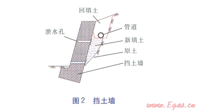 a.如果地貌允許(如荒地),首先進(jìn)行分階削方處理,使管道通過處的坡度≤30°;其次在有可能產(chǎn)生積水或高跌水的位置,考慮設(shè)置漿砌塊石截水墻(見圖l)、排水溝,將水疏導(dǎo)至遠(yuǎn)離管道的地方,避免出現(xiàn)漏斗、溶洞以及對(duì)管溝產(chǎn)生沖蝕。