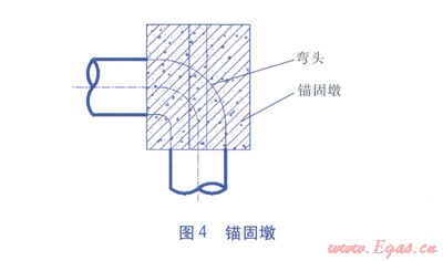 c.無論按照上述a或b哪種情況處理后,都還需要根據(jù)坡長(zhǎng)及管徑設(shè)置錨固墩(見圖4),一般坡長(zhǎng)>25m時(shí),坡腳用素混凝土或灰土墩將彎頭錨固,坡長(zhǎng)>35m時(shí),除下部彎頭錨固以外,陡坡上每隔15~20m采用錨桿固定,錨桿深度應(yīng)在原土或基巖中。