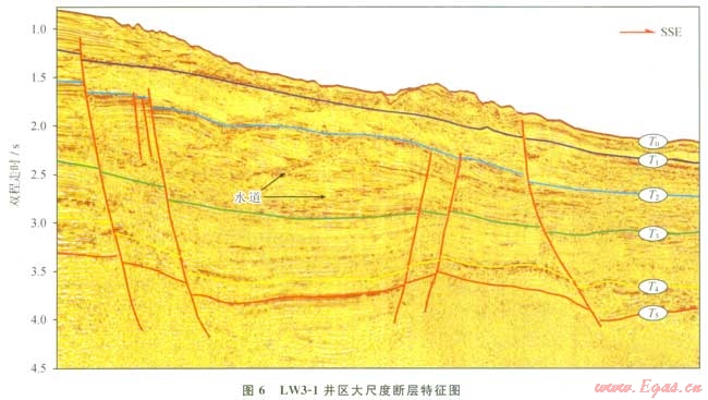 同時(shí),在LW3-1井區(qū)北部和西部發(fā)育了若干條大尺度斷層,平面上呈平行的近W—E向展布(圖3),這些斷層發(fā)育于深部的漸新統(tǒng),至上新世和更新世仍在活動(dòng)(圖6)。大尺度斷層的發(fā)育使得LW3-1井區(qū)的地層表現(xiàn)為地塹/地壘的特征(圖6)。由于大尺度斷層溝通了深部的烴源巖系,可以作為下部烴源巖向上運(yùn)移的重要疏導(dǎo)體系。通過(guò)區(qū)域上含氣層位同位素和流體包裹體的分析,也證實(shí)了大尺度斷層作為運(yùn)移通道的有效性[22]。