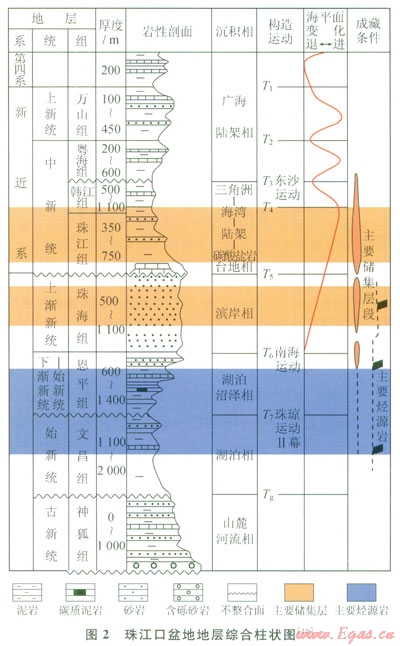 珠江口盆地是位于南海北部大陸架上的中、新生代沉積盆地。盆地呈NE方向展布,具有“三隆兩坳”的構(gòu)造格局,從北至南依次為北部斷階帶、北部坳陷帶、中央隆起帶、南部坳陷帶和南部隆起帶等5個(gè)一級(jí)構(gòu)造單元[7]。神狐水合物鉆探區(qū)和LW3-1井區(qū)均位于白云凹陷南側(cè)(圖1)。以區(qū)域“破裂不整合面——T7,界面”為界,珠江口盆地的構(gòu)造演化可劃分為兩個(gè)階段:斷裂階段和裂后階段[8]。同樣以T7界面為界,盆地垂向上構(gòu)成了下斷上坳的雙層結(jié)構(gòu)和先陸后海的沉積組合[9]。整個(gè)盆地的沉積充填為古新統(tǒng)—下統(tǒng)新統(tǒng)的沉積地層(包括神狐組、文昌組和恩平組),以及古新統(tǒng)—下漸新統(tǒng)的沉積地層(珠海組、珠江組、韓江組、粵海組和萬(wàn)山組)。沉積環(huán)境也發(fā)生了由陸向海、水向深水、由過(guò)補(bǔ)償向欠補(bǔ)償?shù)难葑?/span>(圖2)。