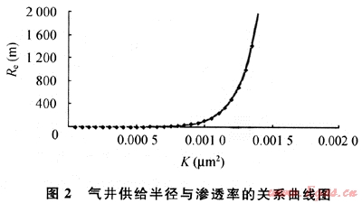 根據(jù)對(duì)不同滲流條件下的供給半徑定量研究表明(見(jiàn)圖2),滲透率小于1×10-3μm2的儲(chǔ)層,供給半徑在300m左右;當(dāng)滲透率大于1.2×10-3μm2時(shí)供給半徑就明顯增加。從圖2中看出:當(dāng)K介于1.2×10-3~1.4×110-3μm2,供給半徑為600~2000m;當(dāng)滲透率大于等于1.4×10-3μm2,供給半徑急劇增加,供給半徑在2000m以上。這說(shuō)明氣藏的非均質(zhì)性對(duì)氣井供氣范圍影響大,井網(wǎng)密度應(yīng)不一樣。沙罐坪、云和寨北區(qū)、臥龍河石炭系氣藏大部分井滲透率小于1×10-3μm2,根據(jù)計(jì)算井距在300~2000km,從目前采出程度較高、非均質(zhì)性較強(qiáng)的福成寨、張家場(chǎng)石炭系來(lái)看,井距1~2km,從理論和實(shí)際開(kāi)發(fā)效果對(duì)比認(rèn)為,沙罐坪、云和寨北區(qū)、臥龍河石炭系氣藏平均井距在1km左右為最好。