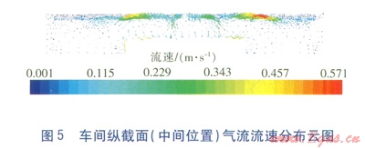 車(chē)間縱截面(中間位置)氣流流速分布云圖見(jiàn)圖5。由圖5可知,車(chē)間室內(nèi)主要工作區(qū)氣流流速為0.50~0.55m/s,相對(duì)于推薦值略高。