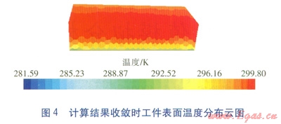 計(jì)算結(jié)果收斂時(shí)工件表面溫度分布云圖見(jiàn)圖4。由圖4可知,計(jì)算結(jié)果收斂時(shí)工件表面溫度在24~25℃,溫度分布均勻,但在工件底部出現(xiàn)了明顯的溫度梯度。筆者認(rèn)為是工件底部與地面接觸處,受輻射角系數(shù)的影響產(chǎn)生了溫度梯度。由模擬結(jié)果可知,工件表面平均溫度呈先升高后下降的趨勢(shì)。模擬開(kāi)始時(shí),以輻射板對(duì)固體工件表面的輻射作用為主,因此工件表面溫度迅速升高,達(dá)到一定溫度時(shí),工件開(kāi)始與周?chē)鷼饬靼l(fā)生對(duì)流換熱,溫度有所下降,直至計(jì)算結(jié)果收斂時(shí),保持在24~25℃。