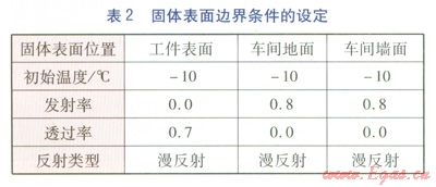 采用S2S(Surface-to-Surface)輻射換熱模型,忽略車(chē)間內(nèi)空氣對(duì)輻射板輻射能的吸收,模擬輻射板對(duì)車(chē)間內(nèi)工件、地面、墻面的熱輻射過(guò)程,以及車(chē)間內(nèi)主要的流固耦合過(guò)程。以基爾霍夫定律為基礎(chǔ),由STAR-CCM+軟件可直接計(jì)算各表面的反射率,從而進(jìn)行輻射換熱量計(jì)算。熱源(即輻射板)與各固體表面邊界條件的設(shè)定見(jiàn)表1、2。
