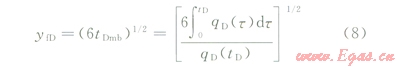 由于探測(cè)邊界yfD隨時(shí)間而變化,直接求解(2)~(4)并非易事,這里采用近似求解方法。首先對(duì)控制方程(2)兩側(cè)先后關(guān)于空間變量(yD)和時(shí)間變量(tD)進(jìn)行積分,利用邊界條件將偏微分方程式(2)轉(zhuǎn)化為探測(cè)邊界內(nèi)物質(zhì)平衡方程: