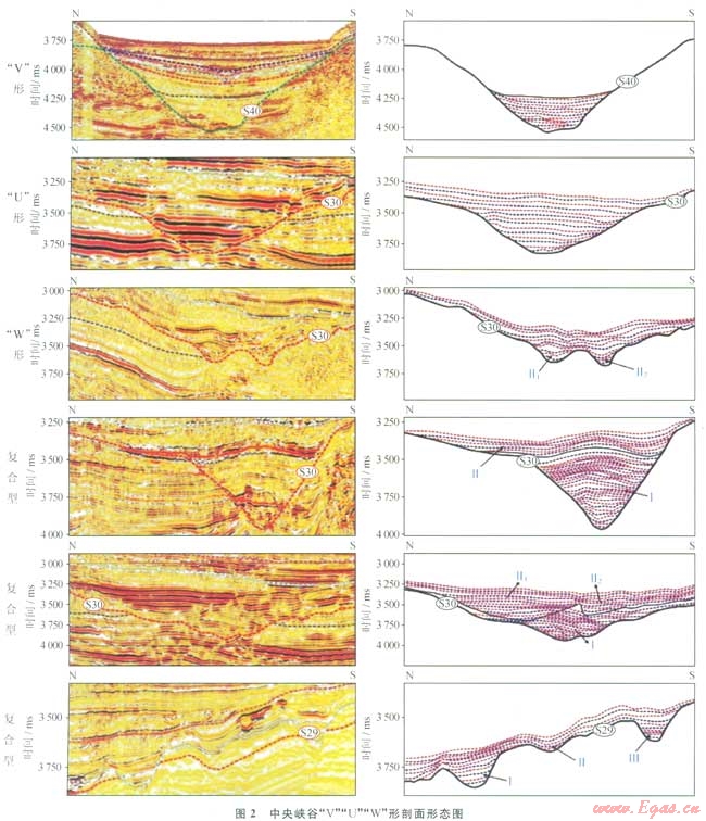瓊東南盆地經(jīng)歷了由陸到海的地質(zhì)演化過程,期間伴隨發(fā)育有多種類型的儲集體:水道砂、低位扇、海底扇、生物礁、濱海砂壩、三角洲、古潛山等。其中以中新世黃流期發(fā)育于整個深水區(qū)中央坳陷帶內(nèi)的中央峽谷水道砂儲集體,特征最明顯。中央峽谷西起鶯歌海盆地東部陸坡,向東終止于南海西北次海盆,總長度425km,寬度最大處為48.5km。其整體呈SW—NE走向,平面上呈“S”形展布,并具有“分段性”特征,由西至東可劃分為樂東段、陵水段、松南寶島段和長昌段(圖1),剖面上呈對稱或不對稱的“V”“U”和“W”形態(tài)[6-7](圖2)。受多種地質(zhì)因素的共同控制,中央峽谷內(nèi)部充填結(jié)構(gòu)具有“多期次性”。充填了相互疊置的多套有利的砂泥巖儲蓋組合,并依靠峽谷邊界側(cè)封和巖性尖滅形成多個構(gòu)造+巖性圈閉,具有極大的勘探潛力。