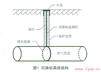為掌握埋地燃?xì)夤艿赖某两敌畔?,結(jié)合燃?xì)夤艿朗┕?,在管道頂部安裝了沉降標(biāo)進(jìn)行監(jiān)測(cè)?,F(xiàn)場(chǎng)沉降標(biāo)由圓形抱箍、不銹鋼監(jiān)測(cè)柱、保護(hù)套管及井蓋構(gòu)成,圓形抱箍圍住管道并用螺絲同定,不銹鋼監(jiān)測(cè)柱焊接在抱箍正上方并伸出至接近地面,監(jiān)測(cè)柱外側(cè)設(shè)置保護(hù)套管,套管頂部設(shè)有保護(hù)井蓋。沉降標(biāo)具體結(jié)構(gòu)見圖1,通過對(duì)不銹鋼柱沉降的測(cè)量反映管道的沉降。