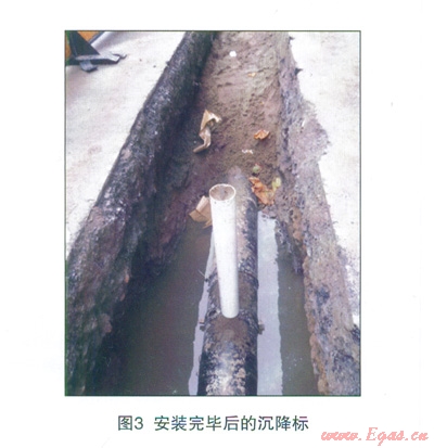 沉降標(biāo)在管道施工的同時(shí)進(jìn)行安裝,有專業(yè)的安裝施工隊(duì)進(jìn)行,保證監(jiān)測(cè)的準(zhǔn)確性。沉降標(biāo)的安裝見圖3所示。