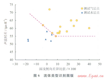 采用深、淺側(cè)向的差異同深電阻率的比值與聲波的交會圖來確定流體性質(zhì)(圖6)。從圖6中看出氣層點都位于右上方,而水層點位于左下方,從測井的原理上看含氣好的層段深淺側(cè)向有較大的正差異特征或者小的負差異,而水層由于淡水鉆井液的侵入會使得電阻率出現(xiàn)負差異,當(dāng)然裂縫的發(fā)育情況及產(chǎn)狀對電阻率的影響比較大,但從解釋結(jié)果看都是以網(wǎng)狀裂縫為主。因此認為電阻率的差異與流體類型存在一定的聯(lián)系。