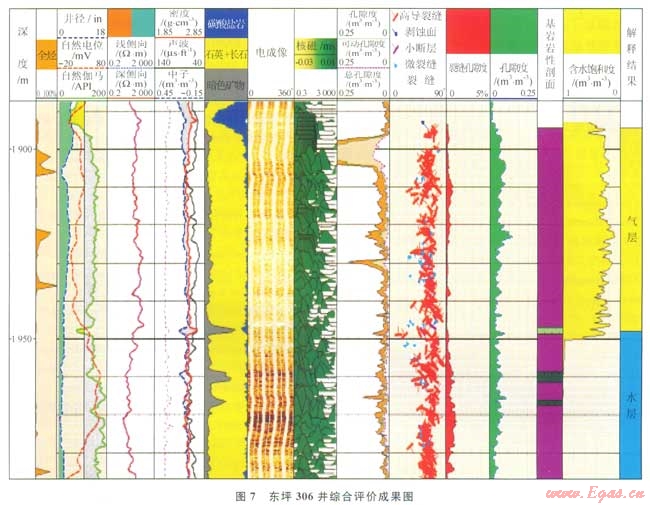 氣層與干層的確定是以孔隙度大大小進行劃分的。核磁資料表明當(dāng)孔隙度為2%時,可動流體只有1%,同時參考了國內(nèi)外眾多的古潛山油氣藏,以孔隙度2%作為有效儲層的下限。據(jù)前述方法對區(qū)塊內(nèi)的井進行了綜合評價,如圖7所示為東坪306井的評價成果圖。該井1894.5m以下為花崗巖,電成像表明高導(dǎo)裂縫非常發(fā)育,裂縫孔隙度分布在0.05%~0.5%之間,總孔隙度為6.2%,計算的含氣飽和度為70%,深、淺側(cè)向有小的正差異氣測錄井顯示較好(中部因取心氣測低),解釋為氣層;下部巖性、物性與上部相當(dāng),但電阻率明顯降低,且深、淺側(cè)向基本重合,氣測無顯示,解釋為水層,據(jù)此確定了氣水界面。其數(shù)據(jù)為:井段1894.5~1950.0m,電阻率20~100W·m,核磁可動孔隙度3.2%,溶蝕孔隙度6.2%,裂縫走向NWSE,裂縫孔隙度0.02%~0.50%,含氣飽和度70%,解釋為氣層;井段1950.0~2097.3m,電阻率4~80W·m,核磁可動孔隙度1.5%,溶蝕孔隙度4.0%,裂縫走向NWSE,裂縫孔隙度0.05%~0.80%,含氣飽和度為0,解釋為水層。