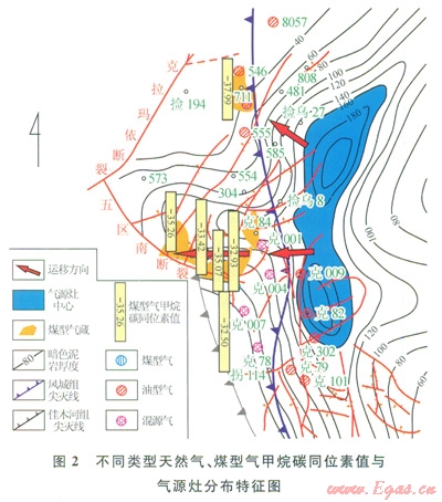 佳木河組干酪根碳同位素值很重,581井、514井和594井9個(gè)樣品干酪根的碳同位素值為-21.96‰~-20.29‰,有機(jī)質(zhì)類型以腐殖型干酪根為主。這套烴源巖成熟度較高,鏡質(zhì)體反射率為1.38%~1.90%,綜合評價(jià)為高成熟的較差氣源巖。依據(jù)沉積古地理推測在凹陷中泥巖的有機(jī)碳含量應(yīng)該更高。因此,佳木河組應(yīng)該是一套(且是研究區(qū)內(nèi)唯一一套)具有一定有機(jī)質(zhì)豐度、演化程度較高、具有生氣能力的烴源巖。加之煤型氣與其碳同位素值相近,并且同一來源天然氣的順層運(yùn)移會(huì)造成碳同位素分餾,以煤型氣為主的天然氣甲烷碳同位素值在該區(qū)區(qū)域性斜坡的背景上,呈現(xiàn)出自佳木河組氣源中心向氣藏方向逐漸變輕的趨勢(圖2),指示了天然氣白東向西的運(yùn)移方向。油型氣來源已有大量研究[12],皆表明其與原油同源,主要來自于風(fēng)城組烴源巖。