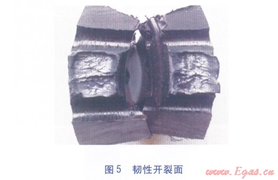 表2中,耐壓(靜液壓)強度試驗合格,即焊接處無破壞,無滲漏;拉伸性能試驗不合格,指焊接接頭破壞類型為脆性開裂(見圖4);拉伸性能試驗合格,則焊接接頭破壞類型為韌性開裂(見圖5)。