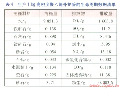 建材的含能(Embodied Energy)近年來(lái)在國(guó)外得到廣泛研究,含能是指產(chǎn)品從自然界原始材料的掘取,經(jīng)過(guò)運(yùn)輸、加工、組裝直至成品出廠前的所有相關(guān)過(guò)程的能耗總和,是基于生命周期的能耗統(tǒng)計(jì)數(shù)據(jù)。顧道金[14]利用國(guó)外含能數(shù)據(jù),建立了中國(guó)建筑產(chǎn)品外推含能數(shù)據(jù)表,并計(jì)算了我國(guó)能源使用背景下lMJ含能的生命周期數(shù)據(jù)清單。對(duì)于保溫層、外護(hù)管,在計(jì)算環(huán)境影響時(shí)都采用此種方法,生產(chǎn)1kg硬質(zhì)聚氨酯泡沫塑料保溫層、高密度聚乙烯外護(hù)管的生命周期數(shù)據(jù)清單(關(guān)鍵數(shù)據(jù))分別見(jiàn)表3、4。