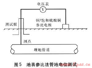 土壤和管道中有電流流過(guò)時(shí)總會(huì)引起電位的變化,通過(guò)管地電位偏移可以對(duì)雜散電流影響進(jìn)行判定。管地電位指埋地燃?xì)夤艿琅c對(duì)應(yīng)參比電極之間的電位差。根據(jù)參比電極位置不同有直接參比法、地表參比法、近參比法、遠(yuǎn)參比法等。地表參比法管地電位測(cè)試接線見(jiàn)圖5。對(duì)于管地電位波動(dòng)頻繁地區(qū),可采用電子記錄儀表代替?zhèn)鹘y(tǒng)電壓表,引申為管地電位連續(xù)監(jiān)測(cè)法。