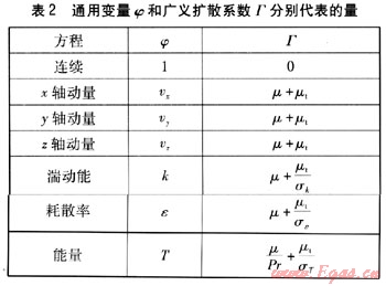 在各個(gè)控制方程中,通用變量φ和廣義擴(kuò)散系數(shù)Γ分別代表的量見表2。