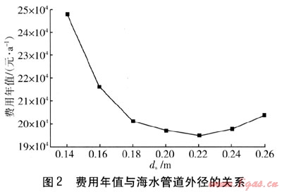 在θn,s=70℃,θn,r=50℃,θs,in=12℃,θs,out=8.6℃,θm,in=4℃,θm,out=8.2℃,以及海水流量為102.86m3/h,中介水流量為98.05m3/h的條件下,費(fèi)用年值與ds的關(guān)系見圖2。由圖2可知,隨著ds的增加,費(fèi)用年值降低很快,這是由于海水流速的降低使阻力降低,海水泵的耗電量降低。達(dá)到最低點(diǎn)(對應(yīng)最優(yōu)管徑)后,管徑繼續(xù)增加,管道造價增加較大,引起費(fèi)用年值增加。