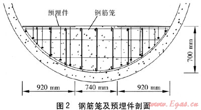 由隧道接收井處向始發(fā)井處進(jìn)行澆筑。當(dāng)混凝土運(yùn)輸車行駛到待澆筑位置時,啟動傳送帶上的電機(jī),打開料斗桶下方的活動擋板,混凝土依靠自重下落到傳送帶上,輸送至待澆筑位置?;炷翝仓r,為保證施工的順利進(jìn)行,需在待澆筑混凝土的正上方設(shè)置鋼支架跳板,跳板需距離混凝土成型面有一定的距離,以保證混凝土正常成型。隧道內(nèi)的混凝土運(yùn)輸時間較長,利用混凝土運(yùn)輸?shù)臅r間進(jìn)行軌道拆除。軌道每段長6m,將拆除的軌道吊掛在隧道壁上。在澆筑混凝土過程中,將預(yù)制好的鋼筋籠和預(yù)埋件安裝好,保證預(yù)埋件上表面水平,且和墊層處于同一水平面,澆筑時要嚴(yán)格按照施工規(guī)范進(jìn)行振搗?;炷翝仓瓿?,在收漿后應(yīng)進(jìn)行養(yǎng)護(hù)。養(yǎng)護(hù)期間覆蓋保溫,并保持濕潤,覆蓋時注意不得損傷和污染混凝土表面。在混凝土上面漫鋪草袋,進(jìn)行灑水養(yǎng)護(hù)[2]。鋼筋籠及預(yù)埋件剖面見圖2。
