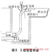S型彎管吊裝見圖8。井壁豎管和兩端彎頭在地面上預(yù)制完成,經(jīng)無損檢測、防腐補(bǔ)口、補(bǔ)傷合格后,進(jìn)行吊裝。吊裝方法同L型彎管的吊裝方法,在焊接豎井下方管口時一定要把握好管道的方向。