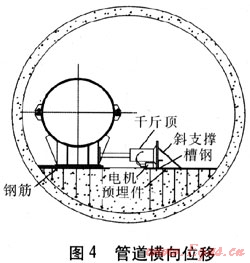 隧道內(nèi)左側(cè)管道焊接完成300m,并且防腐補(bǔ)口完成并合格后,從管道端頭開始橫向位移,管道位移與焊接、補(bǔ)口、補(bǔ)傷同步進(jìn)行。為保證前方作業(yè)人員的安全,制作管道橫向支撐架,支撐在補(bǔ)口、補(bǔ)傷及焊接作業(yè)人員附近。由于管道支架安裝時已經(jīng)在其下方縱向設(shè)置了直徑為10mm的鋼筋,利用推力為500kN的電動千斤頂,并在右側(cè)管道的預(yù)埋件上焊接相應(yīng)的槽鋼或厚鋼板作為千斤頂?shù)牡撞恐吸c(diǎn),千斤頂前方頂住管道支架立板,對左側(cè)管道進(jìn)行整體橫向位移。移動時應(yīng)盡量使管道靠近隧道內(nèi)壁,同時保證管道支架下的鋼筋不脫離支架底板,以免影響位移后的管道就位。每次位移完成后都要將右側(cè)管道預(yù)埋件上的臨時支撐拆除,并利用角磨機(jī)將焊渣等雜物清除干凈。由于管道較長,必須從管道一端逐步進(jìn)行位移。根據(jù)管道直徑及重量,一般采取每根鋼管設(shè)置一個位移點(diǎn),即按順序?qū)⒐艿乐Ъ茉O(shè)置為位移點(diǎn),可同時設(shè)置4個位移點(diǎn)。設(shè)置以300m為1個基本段,對管道進(jìn)行位移,并且保證位移處和前方施工人員始終保持300m距離,完成300m管道位移需移動6次。為防止管道滾動,在位移后的管道支架下方打入三角木楔。每300m管道位移后,在剩余空間敷設(shè)軌道,軌道敷設(shè)時應(yīng)盡量遠(yuǎn)離左側(cè)管道,避免對右側(cè)管道運(yùn)輸造成影響。依次往后,直至把整條管道位移至靠近隧道內(nèi)壁。管道橫向位移見圖4。